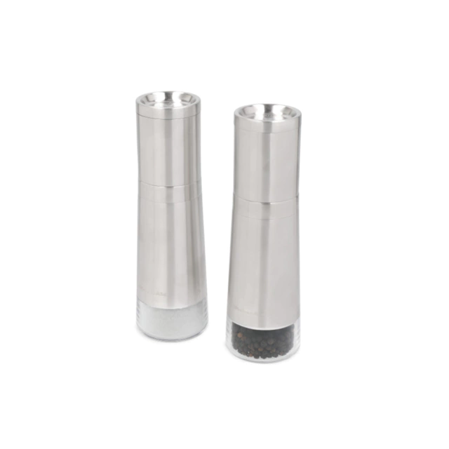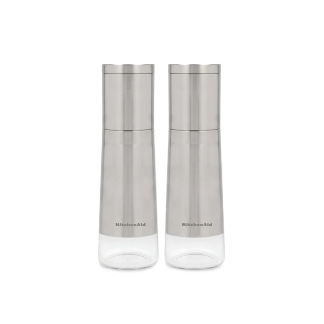 Set de molinillos de sal y pimienta KitchenAid fabricados en acero inoxidable, diseñados para condimentar tus comidas con precisión y facilidad. Cada molinillo incluye un mecanismo de molienda de cerámica resistente a la corrosión, ajustable para obtener un molido fino o grueso según tu preferencia. La tapa de rosca permite recargar de forma sencilla, mientras que la ventana transparente ayuda a controlar el nivel de contenido. Pensados para un uso diario y prolongado, combinan durabilidad con un diseño práctico y elegante. Lavado a mano recomendado.
